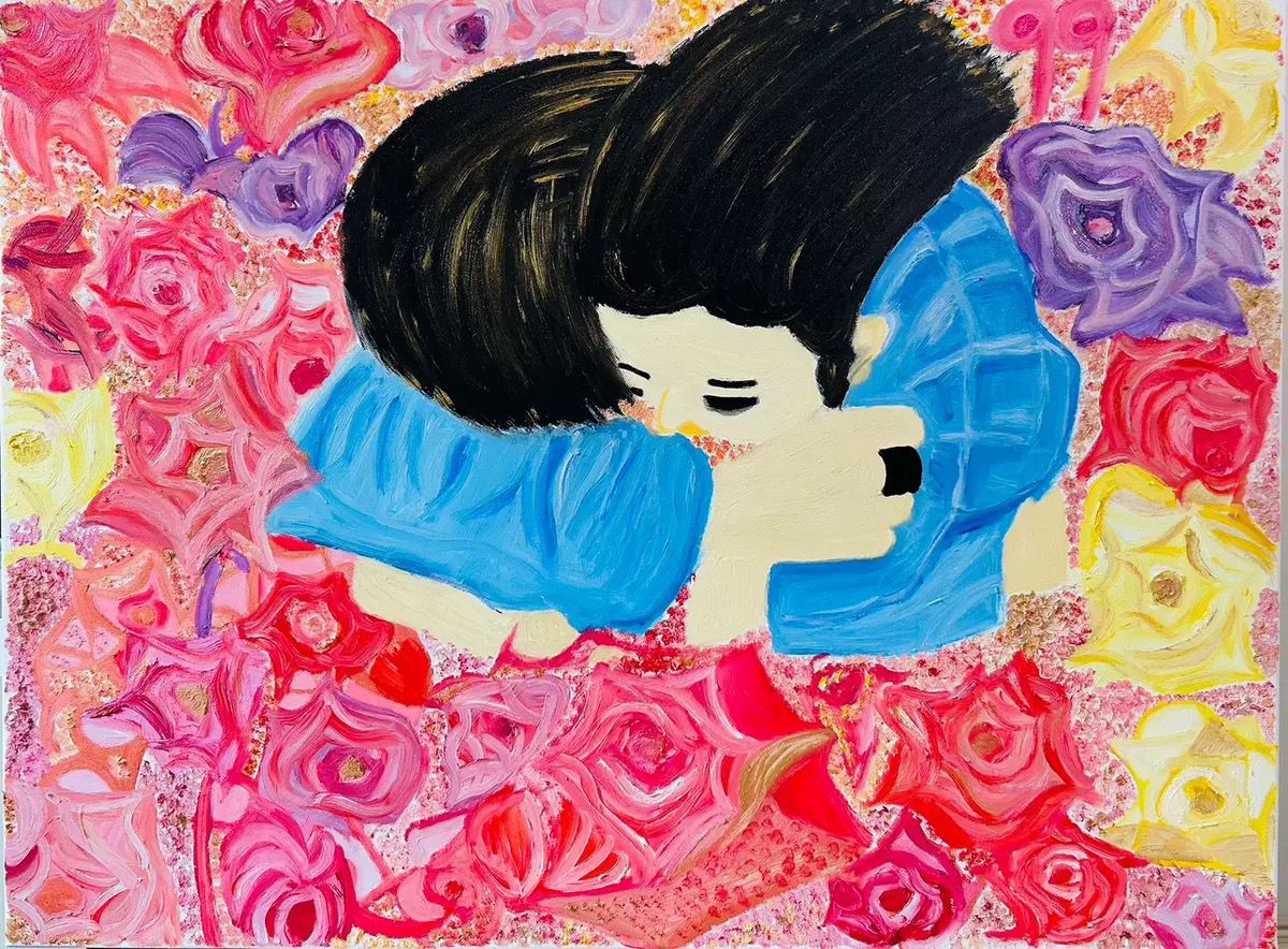 Immerse yourself in the timeless beauty of 99 Eternal Love, a captivating piece from the Lovers’ Series (2025). This vivid painting explores the deep connection between two individuals, captured in a tender embrace amidst a sea of vibrant roses. The swirling hues of red, pink, and yellow blend seamlessly with the couple’s intimate moment, symbolizing the passionate and enduring nature of love. The artwork’s dynamic brushstrokes and bold use of color evoke warmth, affection, and an unbreakable bond.