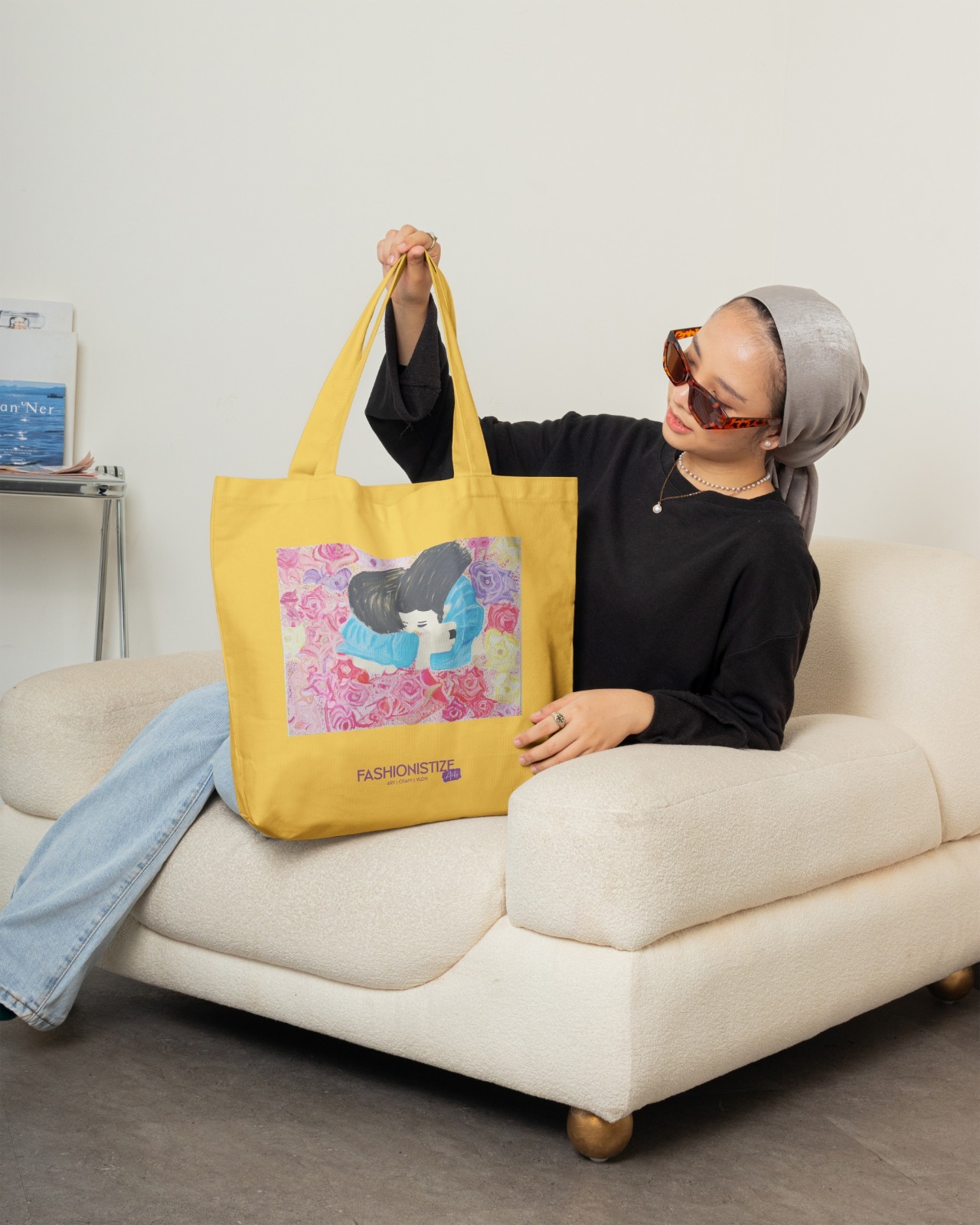 An art-inspired tote bag from the Lovers’ Series featuring an intimate illustration surrounded by roses. Designed for everyday use with emotional depth and artistic expression.