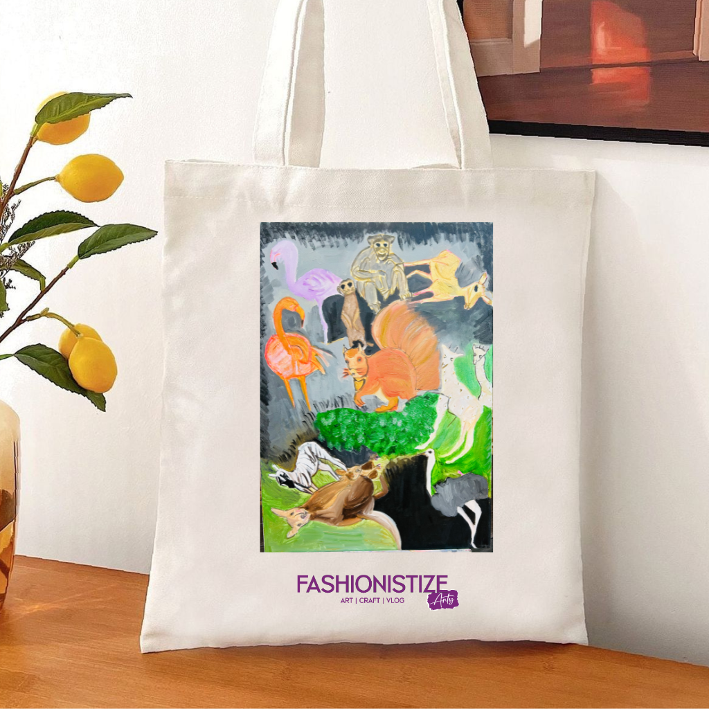 A medium art-inspired canvas bag celebrating compassion and love for animals. Designed for everyday use with expressive artwork and durable quality.