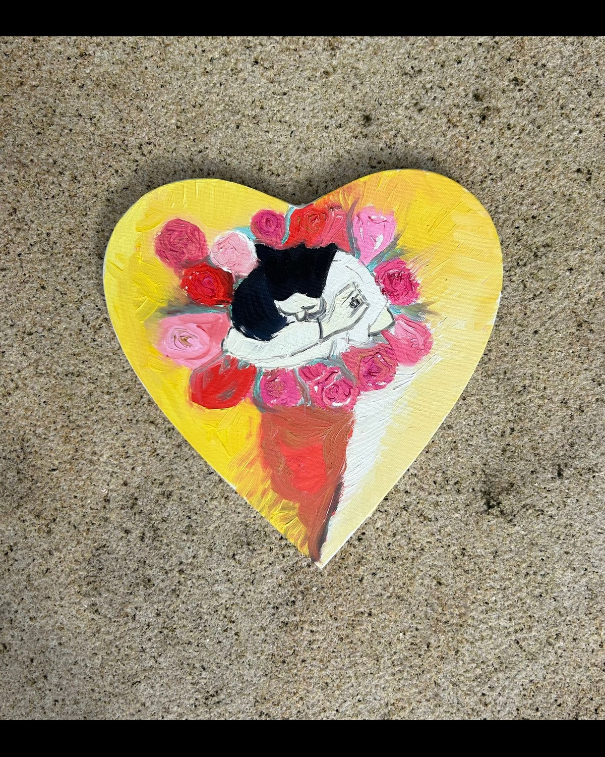 Celebrate love in its purest form with this captivating hand-painted artwork, titled Eternal Love. The piece features a tender, intimate embrace, surrounded by a vibrant bouquet of roses in shades of pink and red. The heart-shaped canvas, with its warm yellow background, evokes feelings of warmth, affection, and passion.