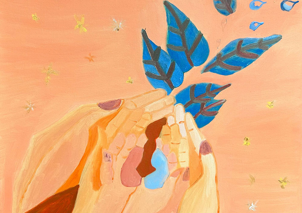 Celebrate the beauty of togetherness with Family, a 2024 original painting that radiates warmth and unity. Soft peach tones form the backdrop for a pair of gently cupped hands, cradling a tender heart and vibrant blue leaves that seem to rise toward the stars. Golden accents scattered across the canvas evoke a quiet sense of wonder and hope.