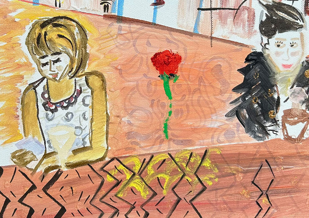 Celebrate the fleeting magic of a first encounter with “First Met – 2024 Lovers Painting”. This original acrylic painting captures a poignant moment between two strangers at a café, brought together by a single red rose—a timeless symbol of romance and new beginnings.